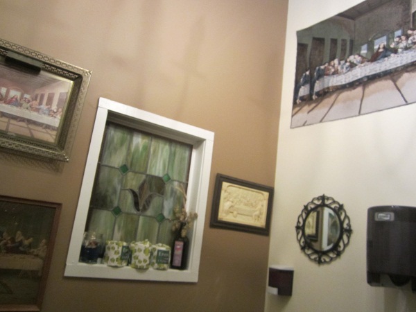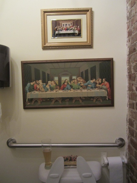 As with most people, when I am drinking at a bar I usually have to make room for more beer. So I traversed back downstairs and into the bathroom where the blasphemy took it to a whole new level. Above the pisser I found a portrait of The Last Supper.