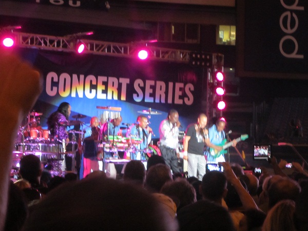We decided to go catch the end of the game from any open seats we could find behind home plate. This turned out to be a terrific idea because as we sat down the elderly lady next to us offered us her wristbands. Wristbands, for what? Oh yeah, its throwback night, there is an Earth Wind and Fire concert on the field after the game. Score.