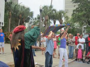 The people in Florida are more bold and more willing to meet others. This oddly dressed performer was able to pull two complete strangers from the crowd and suggest that they kiss each other on stage. And it was passionate.